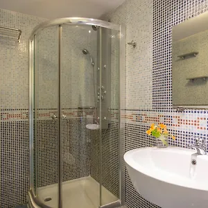 Cuenta con una cocina pequeña y un baño privado con un aseo separado, una bañera y una ducha.